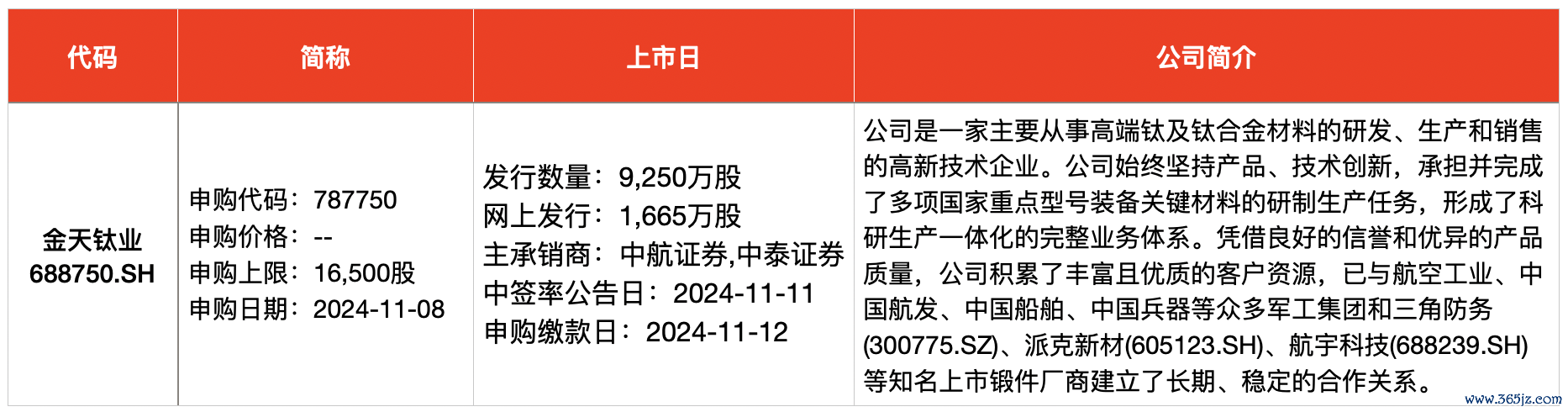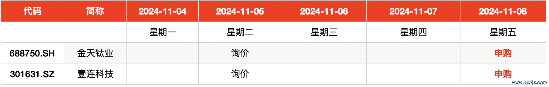 澎湃新闻根据公开信息梳理统计,本周(11月4日-11月8日),2只新股安排网上申购。申购的新股为湖南湘投金天钛业科技股份有限公司(简称“金天钛业”,688750.SH);深圳壹连科技股份有限公司(简称“壹连科技”,301631.SZ)。其中,壹连科技为国内较早实现电芯连接组件产品规模化供应的厂商,是宁德时代的核心供应商。