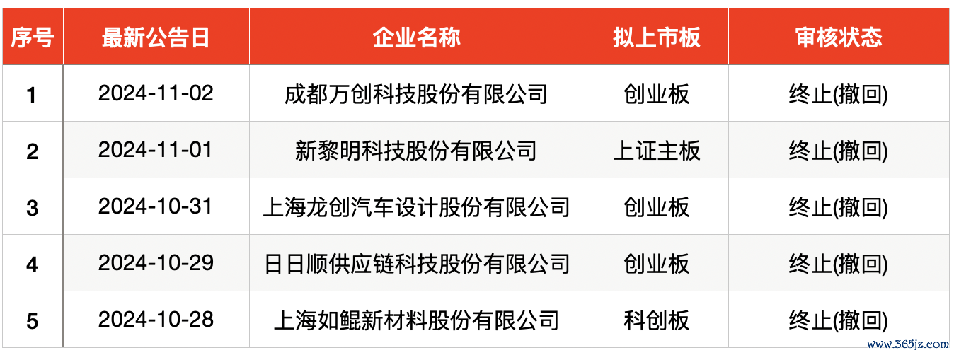 上周共有5家企业终止IPO,分别为成都万创科技股份有限公司、新黎明科技股份有限公司、上海龙创汽车设计股份有限公司、日日顺供应链科技股份有限公司、上海如鲲新材料股份有限公司。