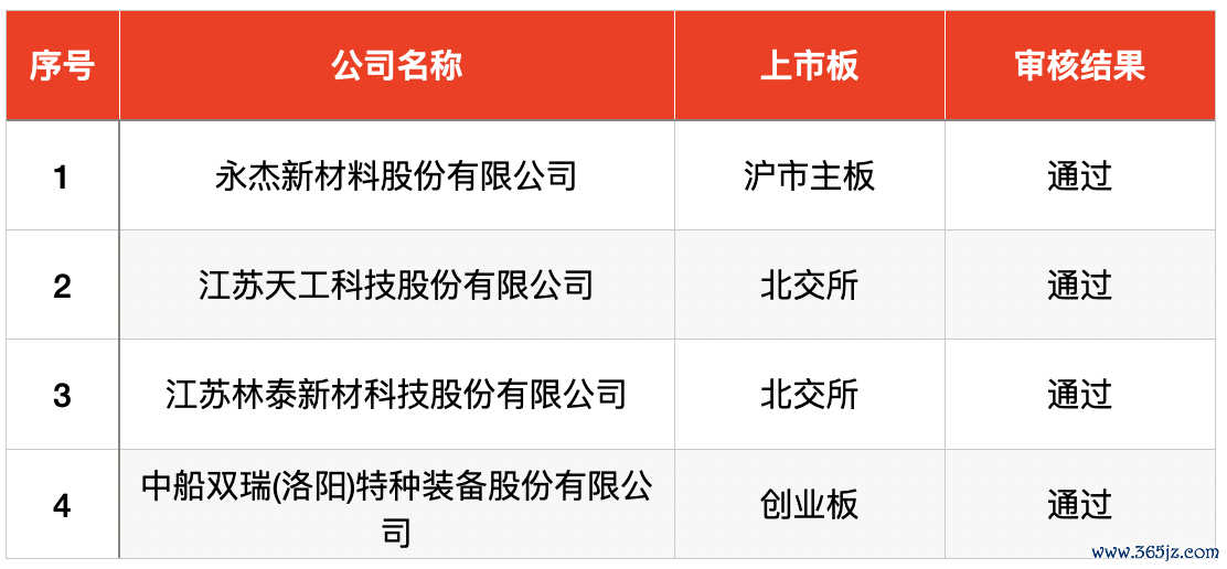 其中,北交所审核2家IPO企业江苏天工科技股份有限公司(简称“天工股份”)及江苏林泰新材科技股份有限公司(简称“林泰新材”),均获得通过;上交所审议的IPO发行人为永杰新材料股份有限公司(简称“永杰新材”),获得通过;深交所审议的IPO发行人为中船双瑞(洛阳)特种装备股份有限公司(简称“双瑞股份”),获得通过。