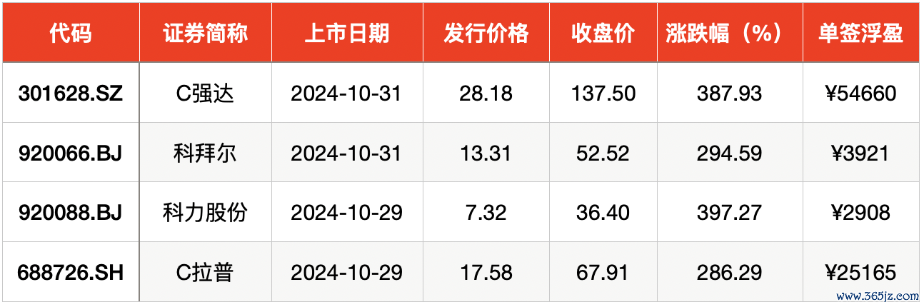 10月31日,科拜尔在北交所上市,发行价格为13.31元/股。截至上市首日收盘,该股报52.52元,上涨294.59%。以收盘价计算,投资者中一签浮盈高达3921元。